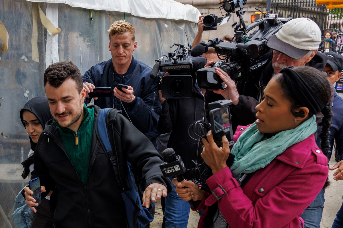 epa11958510 (FILE) A file picture of Columbia University pro-Palestinian activist Mahmoud Khalil (L) as he is followed by the press after student negotiators were denied access to the campus and gave a press briefing following pro-Palestine students' takeover of Hamilton Hall on Columbia University's campus in New York, New York, USA, 30 April 2024 (reissued 12 March 2025). Mahmoud Khalil was arrested by US Immigration and Customs Enforcement (ICE) agents on 08 March 2025 as part of US President Trump's crackdown on pro-Palestinian campus protesters. EPA/SARAH YENESEL