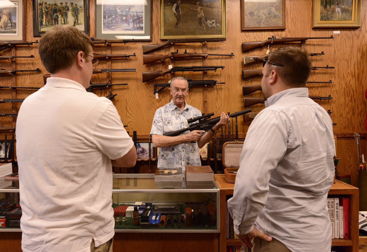 epa03319934 Saleman Jack Riddle (C) shows a Colt AR-15 rifle to Ryan Sullivan (L) and Robert Brush at Chuck's Firearms gun store in Atlanta, Georgia USA, 27 July 2012. Reaction to the mass shooting at a movie theater in Aurora, Colorado, has included calls for further restrictions on certain weapons and high capacity ammunition clips. EPA/ERIK S. LESSER