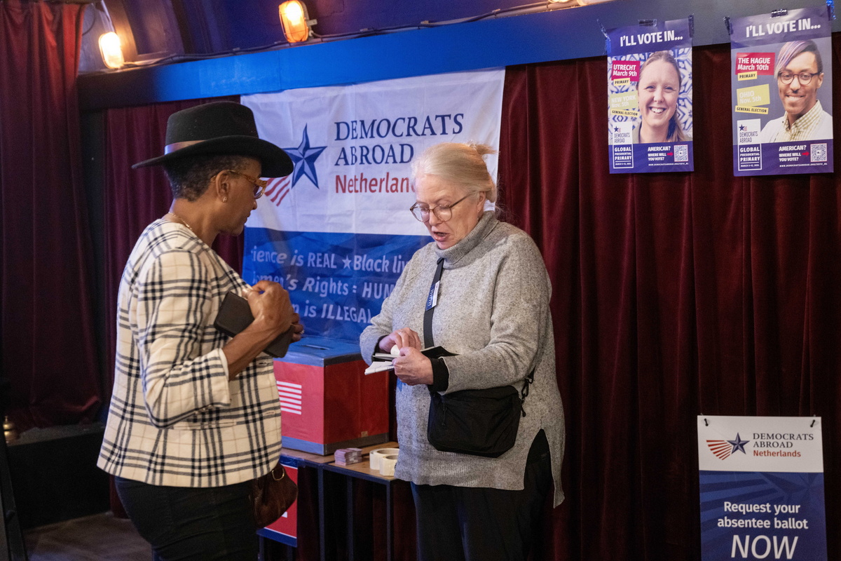 epa11200763 US citizens cast their votes for the US primaries in the comedy club Boom Chicago, in Amsterdam, Netherlands, 05 March 2024. US voters head to the polls in 15 states spanning the breadth of the continent on so-called Super Tuesday, to determine the Democrats and Republicans presidential candidates. EPA/Evert Elzinga