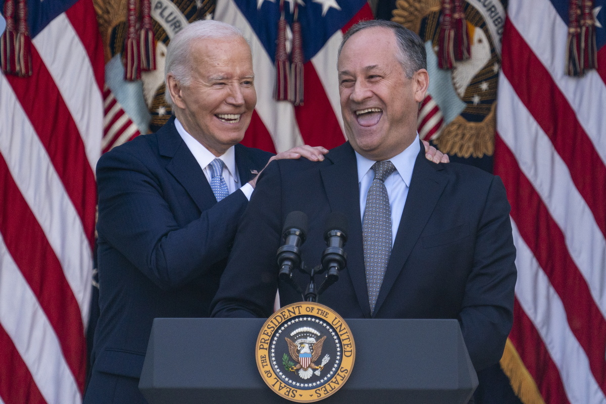 epaselect epa11356806 Second Gentleman Doug Emhoff (R), with US President Joe Biden (L), react as they deliver introductory remarks for Jewish American Heritage Month during a celebration in the Rose Garden of the White House in Washington, DC, USA, 20 May 2024. The Biden administration has denounced efforts by the International Criminal Court to seek arrest warrants for top Israeli officials. EPA/SHAWN THEW