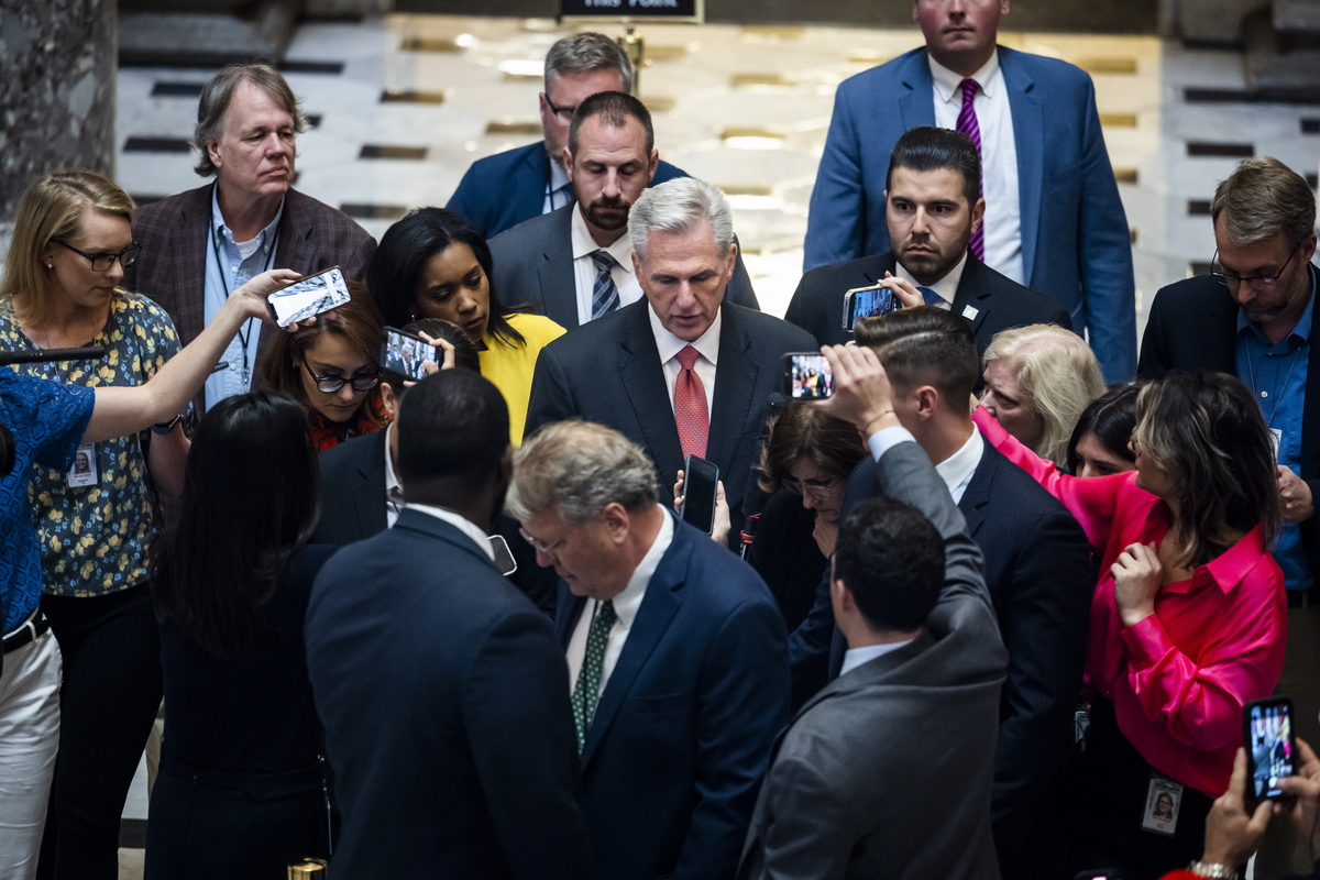 epa10630110 Republican Speaker of the House Kevin McCarthy (C) speaks to reporters about negotiations with the White House over the debt limit as he walks from the House floor in the US Capitol in Washington, DC, USA, 15 May 2023. McCarthy and Congressional leaders are scheduled to resume discussions on the debt ceiling with US President Biden on 16 May. Secretary of the Treasury Janet Yellen has warned the US could default on its debt as early as 01 June 2023, if Congress fails to raise the debt limit. EPA/JIM LO SCALZO