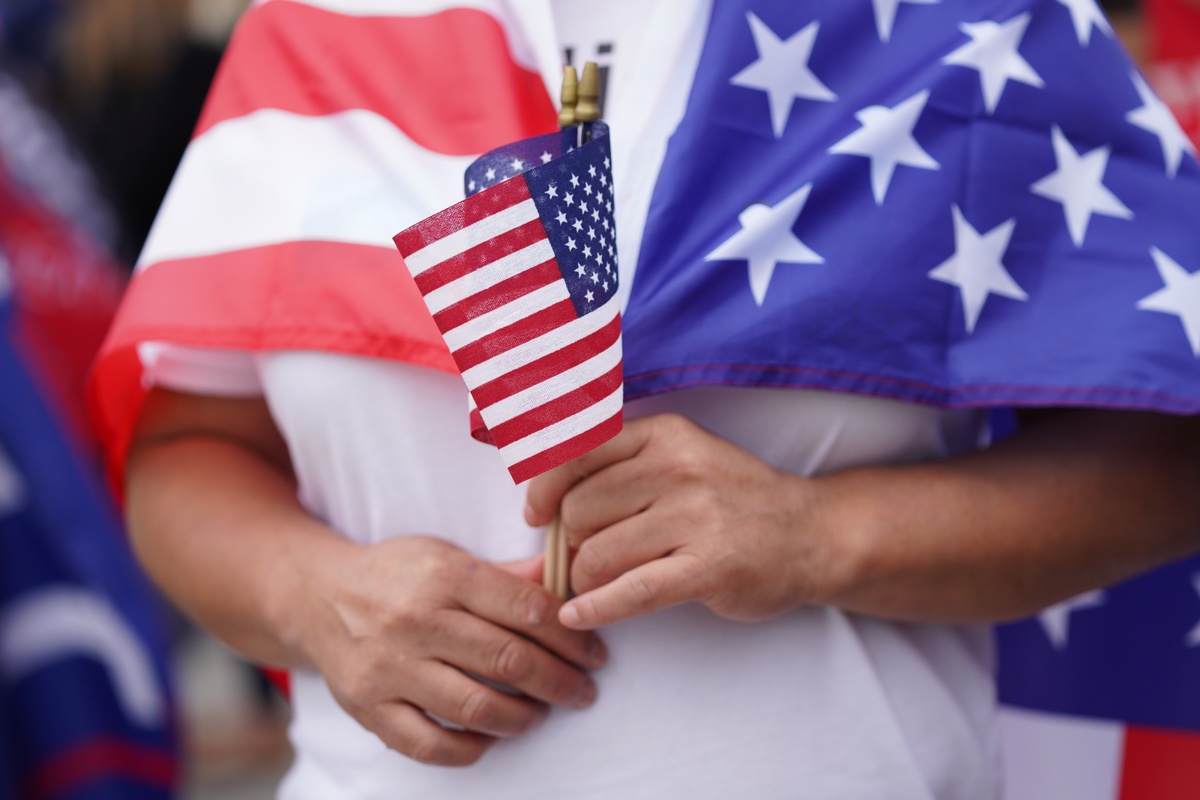 epa10891061 A pro Trump supporter holding American flags rallys outside the California GOP convention where former US President Donald Trump is scheduled to deliver a speech in Anaheim, California, USA, 29 September 2023. EPA/ALLISON DINNER