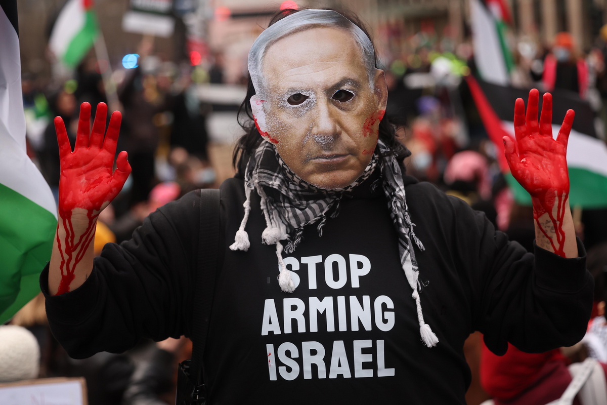 epaselect epa11061050 A protester wearing a Benjamin Netanyahu mask displays fake blood on hands during a march in support of Palestine in London, Britain, 06 January 2024. Members of protest groups including Black Lives Matter and the Free Palestine Coalition protested in central London to demand ceasefire in the Israel Palestinian conflict. EPA/NEIL HALL