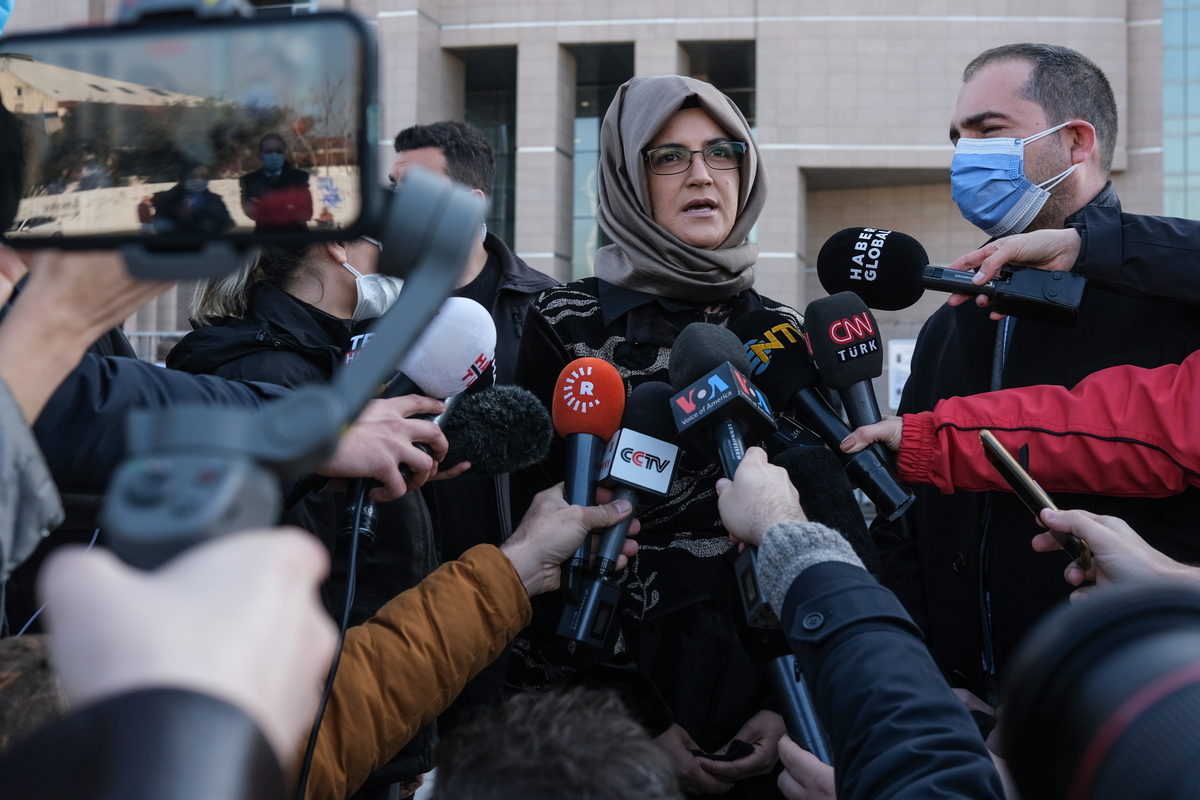 epa09050641 Hatice Cengiz (2-R), the fiancee of murdered Saudi journalist Jamal Khashoggi, speaks to the media after a trial on Khashoggi's murder, in Istanbul, Turkey, 04 March 2021. Cengiz on 01 March issued a statement calling for justice over the killing of Khashoggi and demanded Saudi Crown Prince Mohammed bin Salman (MBS) be punished for his role in the murder after a US report by the Office of the Director of National Intelligence claimed MBS 'approved an operation in Istanbul, Turkey to capture or kill Saudi journalist Jamal Khashoggi'. EPA/SEDAT SUNA