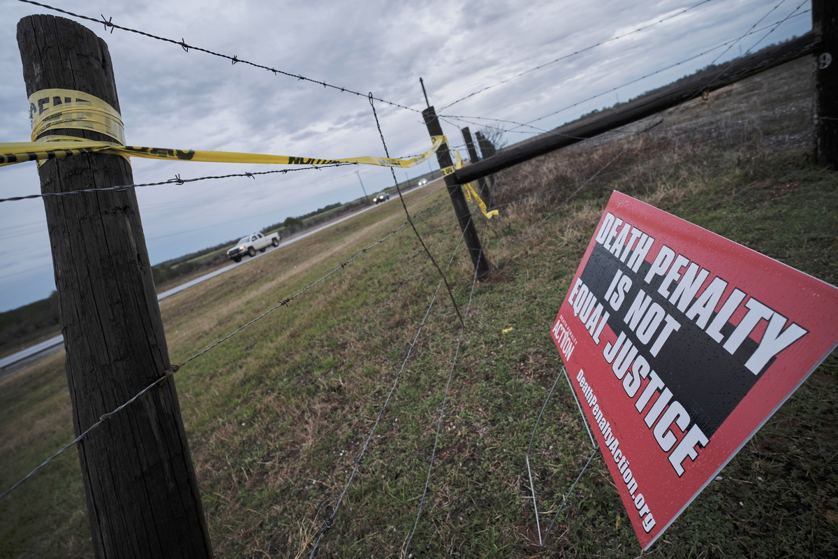 epa11104545 A protest sign against the death penalty is displayed outside of the W.C. Coleman Correction Facility where the State of Alabama is planning the execution of convicted killer Kenneth Eugene Smith in Atmore, Alabama, USA, 25 January 2024. There have been protests by several human rights groups who claim the experimental method of using nitrogen gas hypoxia to execute people may not work. EPA/DAN ANDERSON