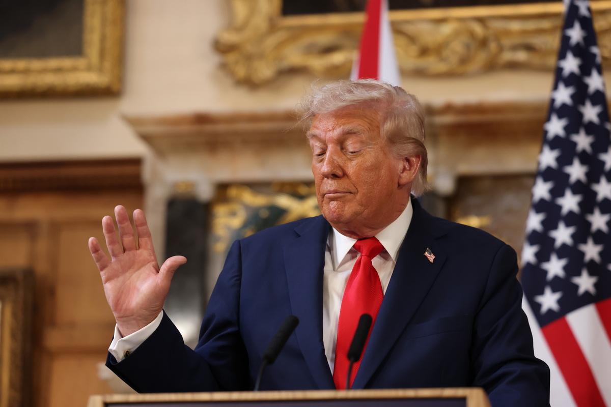 epa12387660 US President Donald J. Trump speaks during a press conference during their visit to Chequers, the country residence of the Prime Minister in Aylesbury, Britain, 18 September 2025. President Trump is on his second state visit to the UK where he met with the King and with the Prime Minister Starmer. EPA/NEIL HALL / POOL