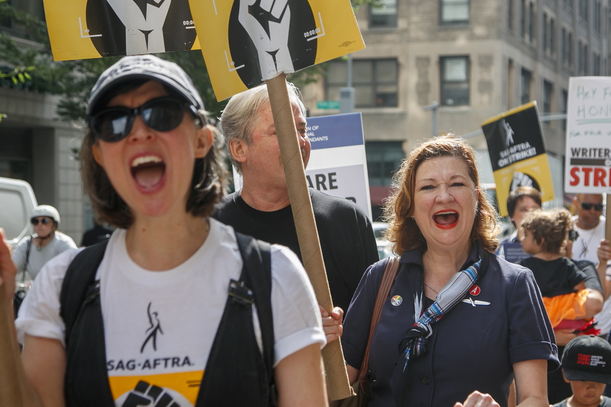 epa10804269 Those part of the Association of Professional Flight Attendants join the picket line with Writer Guild of America and SAG-AFSTRA outside of Warner Bros. Discovery and the Netflix HQ in New York, New York USA, 17 August 2023. Television networks and movie studios are still unable to agree on proposed pay raises and changes to the industry’s business model. EPA/SARAH YENESEL