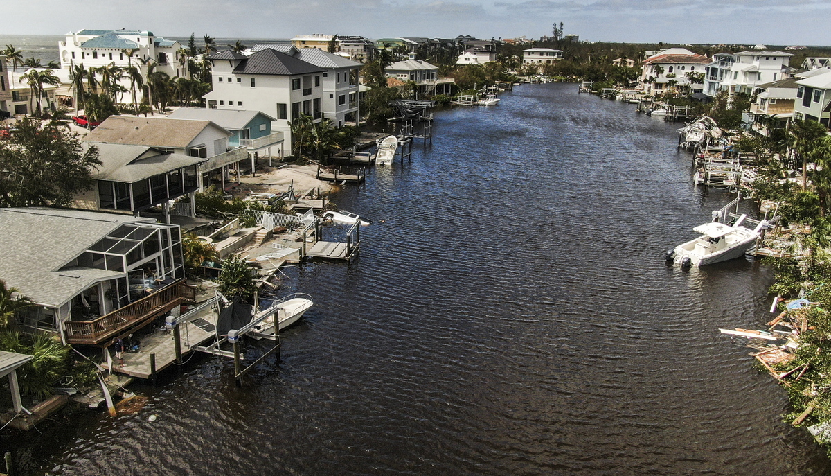 epa10214477 An aerial photo made with a drone shows the damage caused to properties in the wake of Hurricane Ian in Bonita Shores, Florida, USA, 29 September 2022. Hurricane Ian came ashore as a Category 4 hurricane on 28 September causing widespread damage and power outages. EPA/TANNEN MAURY