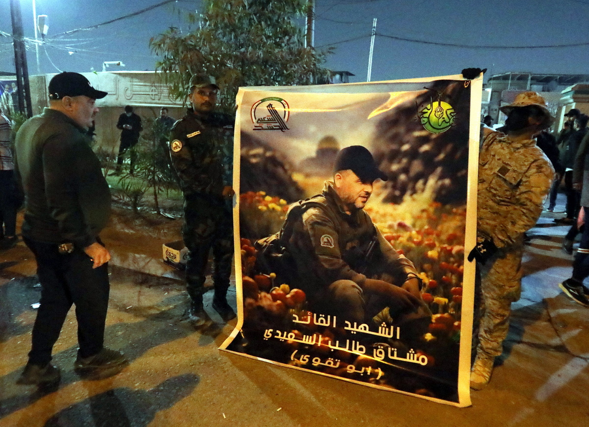 epa11057523 Members of Iraqi Shiite Popular Mobilization Forces (PMF) carry the picture of their leader Abu Taqwa Al-sia'di, who was killed in a US drone attack in Baghdad, Iraq, 04 January 2024. A US drone strike on January 4, targeted an Iranian-backed Popular Mobilization Forces base in eastern Baghdad, killing two commanders and wounding six others from the Popular Mobilization Forces' 12th Brigade, PMF announced to the media. EPA/AHMED JALIL