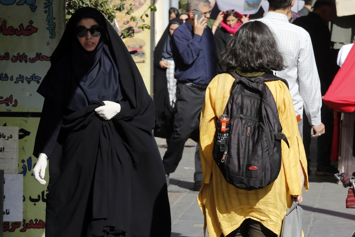 epa10858499 Veiled Iranian woman walks next to a girl without the mandatory headscarf, in a street in Tehran, Iran, 13 September 2023. Iranians are marking the first anniversary of Mahsa Amini's death which led to nationwide protests over the country's mandatory dress code (Hijab) law. Protests erupted after the death of 22-year old Iranian woman, Mahsa Amini, detained by morality police for not wearing the hijab properly in September 2022. Since then, a growing number of women in the country have been defying authorities by removing the headscarf. EPA/ABEDIN TAHERKENAREH