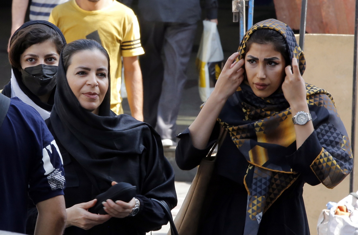 epa10209337 An Iranian woman adjusts her scarf as she walks in a street, in Tehran, Iran, 27 September 2022. Iran has been facing many anti-government protests following death of Masha Amini, a 22 year old girl, who was detained on 13 September by the police unit responsible for enforcing Iran's strict dress code for women. Amini was declared dead on 16 September, after she spent 3 days in a coma. Protests first broke out in Saqez, hometown of Amini, during her funeral on 17 September. EPA/ABEDIN TAHERKENAREH