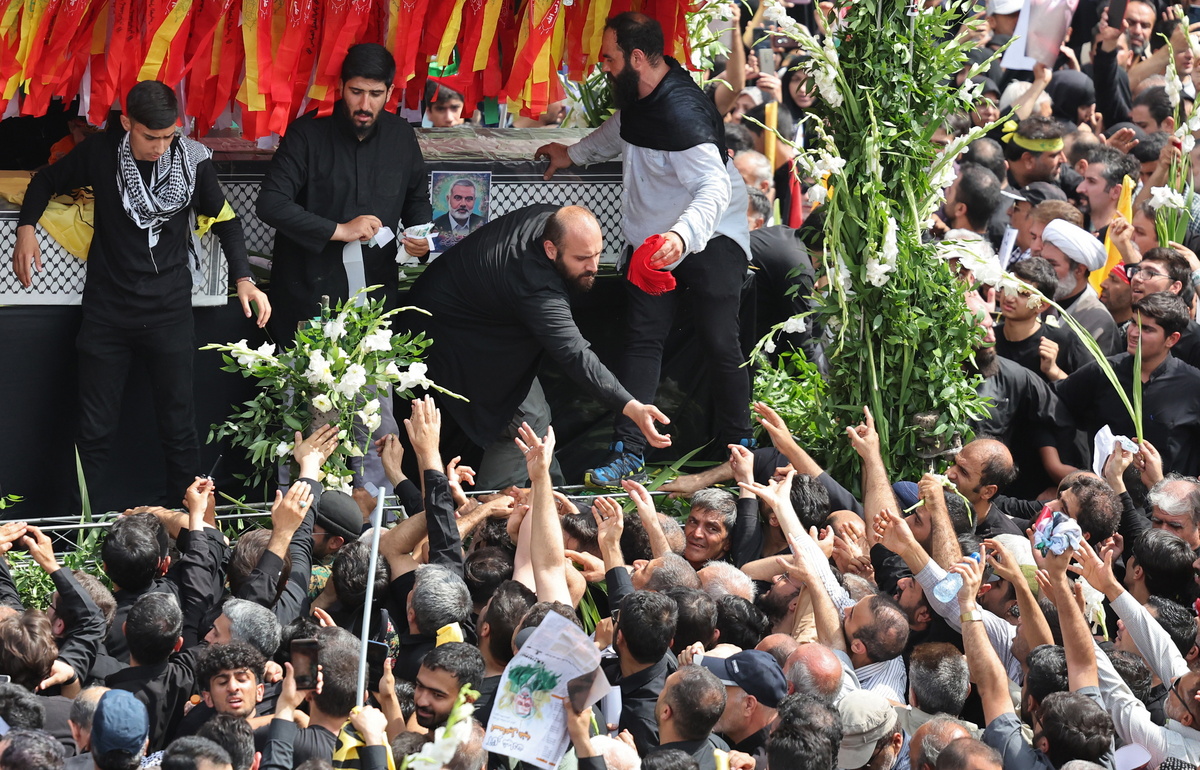 Πλήθος σε πένθος —αρκετοί παρευρισκόμενοι κράταγαν παλαιστινιακές σημαίες ή πορτρέτα του ηγέτη της Χαμάς— συγκεντρώθηκε στο Πανεπιστήμιο της Τεχεράνης, στην καρδιά της πόλης.