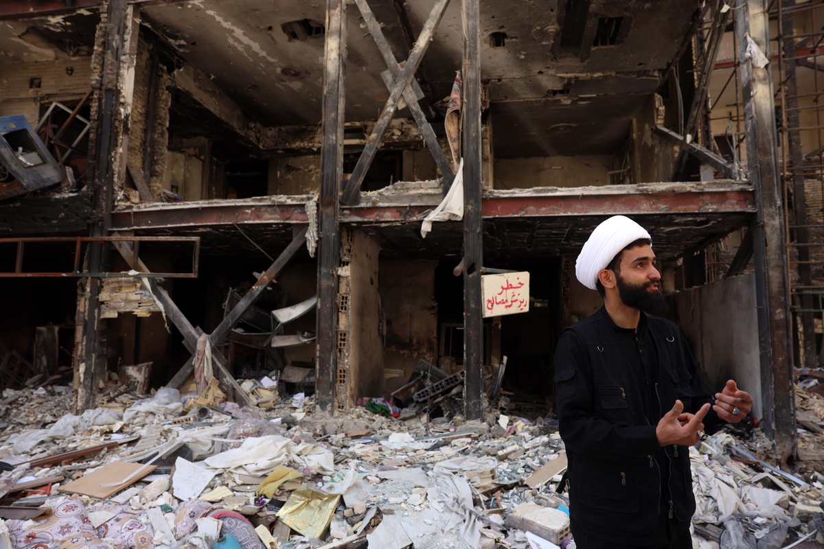 epa12888984 An Iranian cleric by damaged residential buildings which were destroyed by US-Israeli airstrikes at the Shahid Broujerdi residential complex in southern Tehran, Iran, 14 April 2026. The ceasefire is holding but Iran and the United States have failed to reach an agreement after peace talks were held in Islamabad on 11 April. EPA/ABEDIN TAHERKENAREH