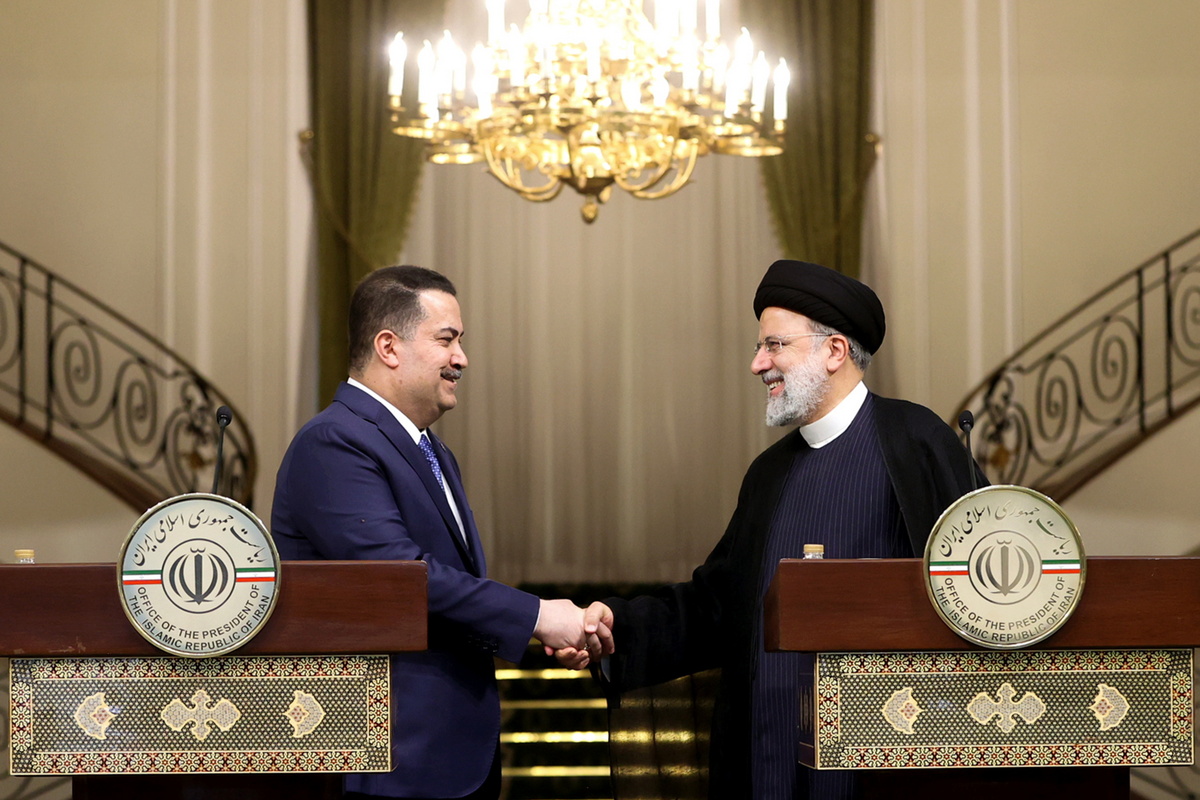 epa10960178 A handout photo made available by the Iranian Presidential Office shows Iranian President Ebrahim Raisi (R) shaking hands with Iraqi Prime minister Mohammed Shia al-Sudani during a joint press conference in Tehran, Iran, 06 November 2023. The unannounced visit by Al Sudani come after US Secretary of State Antony Blinken visited Iraq on 05 November. Al Sudani is in Tehran to meet Iranian officials and discuss the Israeli-Gaza conflict. EPA/Iranian Presidential Office / HANDOUT HANDOUT EDITORIAL USE ONLY/NO SALES HANDOUT EDITORIAL USE ONLY/NO SALES