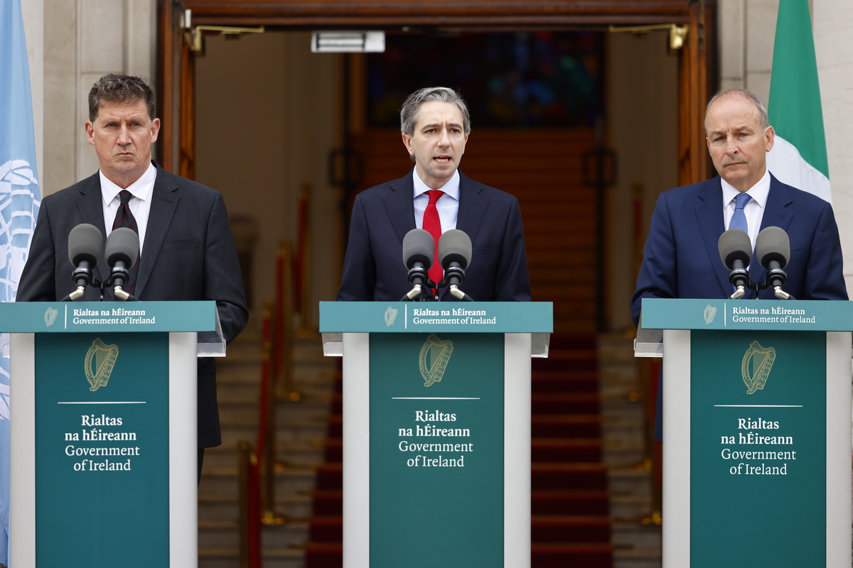 epaselect epa11359418 Irish Taoiseach (Prime Minister) Simon Harris (C), Foreign Minister Micheal Martin (R) and Environment Minister Eamon Ryan (L) hold a press conference at the Government Buildings in Dublin, Ireland, 22 May 2024. Ireland has recognized the state of Palestine. Norway has also announced that it will recognize Palestine and Spain is expected to follow. Recognizing Palestinian statehood has been a cornerstone of Irish foreign policy as part of it's belief in a two-state solution to the conflict in Gaza. EPA/TOLGA AKMEN