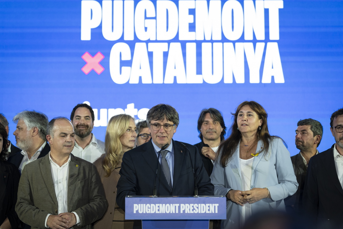 epa11336198 Catalonian JxCat party candidate Carles Puigdemont (C) delivers a press conference during the Catalonia regional election, in Argeles-sur-Mer, France, 12 May 2024. Catalonia holds regional elections on 12 May in which Catalans are called to elect the 15th Parliament of the autonomous community of Catalonia. EPA/David Borrat