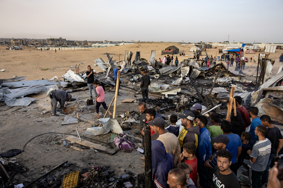 epa11372896 Palestinians inspect the damage after an Israeli army raid on a camp at an area designated for displaced people in Rafah, southern Gaza Strip, 27 May 2024. At least 40 people were killed after Israeli airstrikes hit an area in Rafah designated for the displaced, the Palestinian Civil Defense said. More than 35,000 Palestinians and over 1,400 Israelis have been killed, according to the Palestinian Health Ministry and the Israel Defense Forces (IDF), since Hamas militants launched an attack against Israel from the Gaza Strip on 07 October 2023, and the Israeli operations in Gaza and the West Bank which followed it. EPA/HAITHAM IMAD