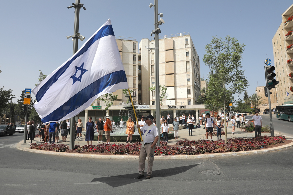 epa09913745 A man waves a large Israeli flag as people stand still as sirens sound across the country during the Holocaust Remembrance Day, in Jerusalem, Israel, 28 April 2022. Sirens echoed across Israel for two minutes in memory of the Jews killed in the Holocaust. EPA/ABIR SULTAN