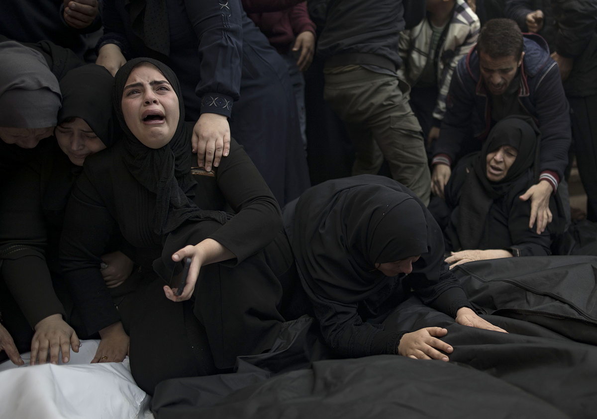 epaselect epa11038346 Relatives of Palestinians from the Nassar family, who died during Israeli air strikes in the southern Gaza Strip, mourn next to their wrapped bodies, outside Nasser Hospital in Khan Yunis, southern Gaza Strip, 20 December 2023. Israeli forces resumed military strikes on Gaza after a week-long truce expired on 01 December. More than 18,000 Palestinians and at least 1,200 Israelis have been killed, according to the Palestinian Health Ministry and the Israel Defense Forces (IDF), since Hamas militants launched an attack against Israel from the Gaza Strip on 07 October, and the Israeli operations in Gaza and the West Bank which followed it. EPA/HAITHAM IMAD