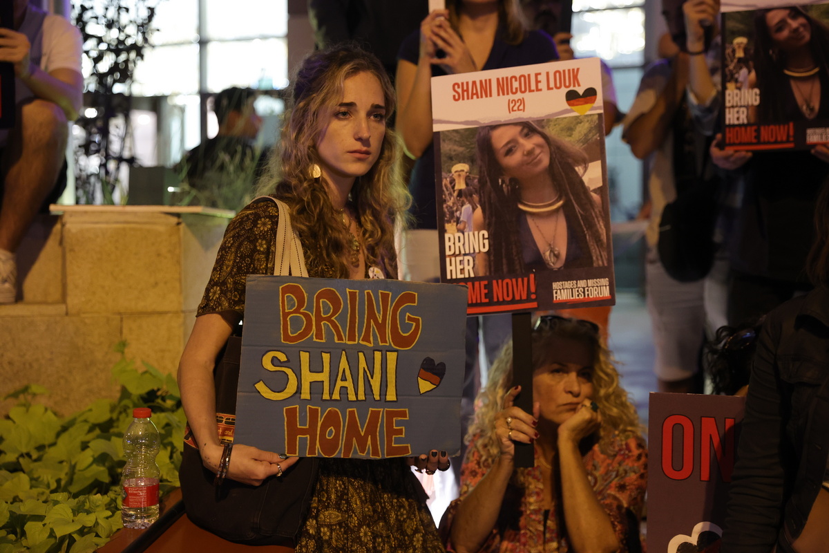 epa10923993 Relatives of Israelis abducted during the 07 October attack by Hamas militants call on German Chancellor Olaf Scholz to help release Israeli-German citizens, outside the German embassy in Tel Aviv, Israel, 17 October 2023. At least 199 people are being held captive by Hamas, Israel said. More than 3,000 Palestinians and 1,400 Israelis have been killed according to the Israel Defense Forces (IDF) and Palestinian Health Ministry, after Hamas militants launched an attack against Israel from the Gaza Strip on 07 October. EPA/ABIR SULTAN