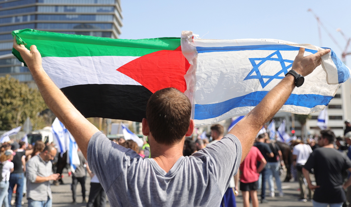 epa10496642 A man holds up the Israeli and Palestine flags as demonstrators block the Ayalon Road in the center during an anti-government protest in Tel Aviv, Israel, 01 March 2023. People have been protesting all over the country against the government’s justice system reform. EPA/ABIR SULTAN