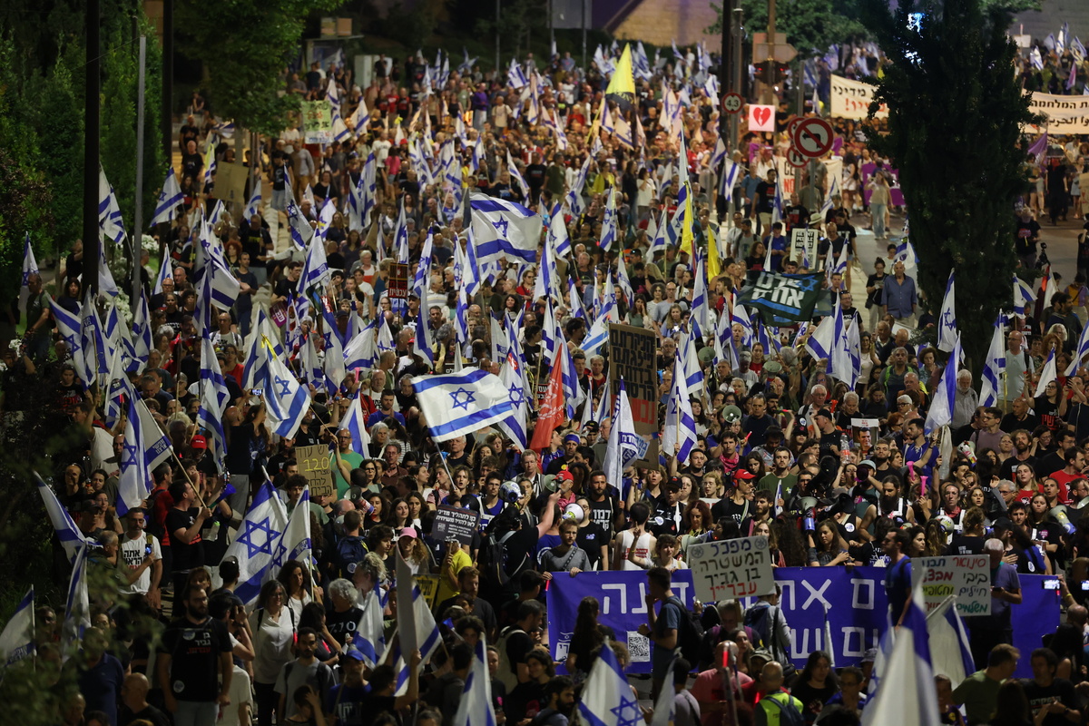 Χιλιάδες άνθρωποι βρήκαν στους δρόμους της Ιερουσαλήμ χθες βράδυ, με σπάνια μαζικότητα τους τελευταίους οκτώ και πλέον μήνες πολέμου, για να διαδηλώσουν κοντά στην κατοικία του πρωθυπουργού Μπενιαμίν Νετανιάχου και στην Κνέσετ, την ισραηλινή Βουλή.