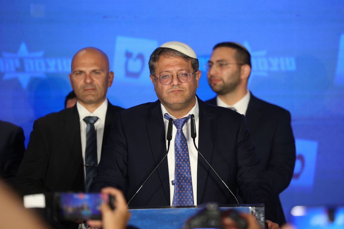 epa10280439 Israeli MP and leader of far-right Otzma Yehudit (Jewish Power) party Itamar Ben Gabir thanks his supporters after the first TV election results models showed his party gaining 15 Knesset sits during a final election event in Jerusalem, Israel, 01 November 2022. EPA/ABIR SULTAN
