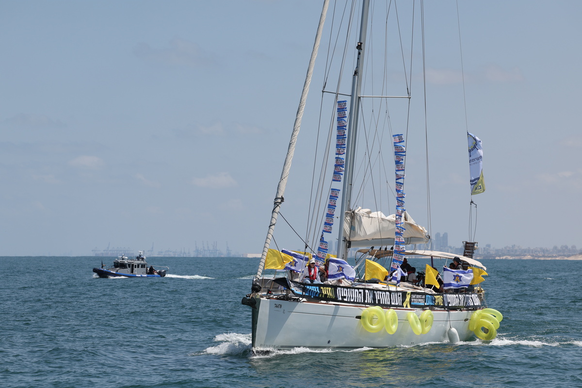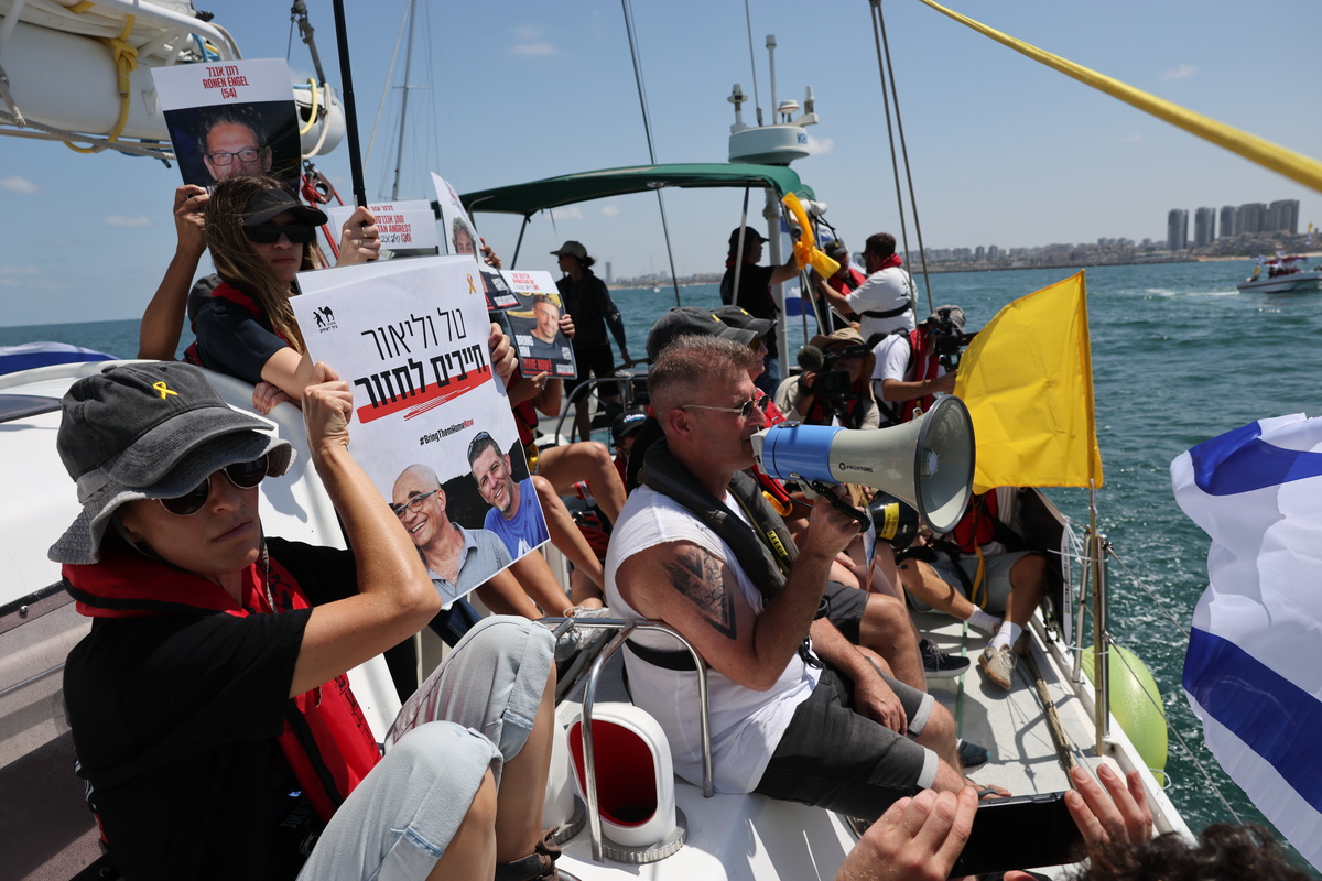 Όπως μεταδίδει η ΕΡΤ, περισσότερα από 20 άτομα επιβιβάστηκαν σε διάφορα ιστιοφόρα που απέπλευσαν από την παραθαλάσσια πόλη Ασκέλον, φέρνοντας κίτρινες σημαίες και αφίσες με τις φωτογραφίες των ομήρων, ενώ φώναζαν τα ονόματά τους.