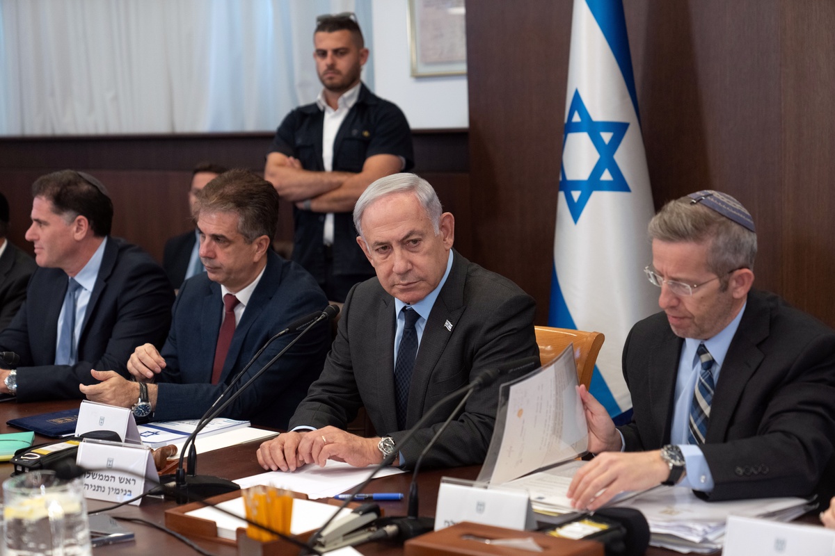 epa10751119 Israeli Prime Minister Benjamin Netanyahu (2-R), Israel’s Foreign Minister Eli Cohen (2-L) and cabinet secretary Yossi Fuchs (R) attend a cabinet meeting at the prime minister's office in Jerusalem, 17 July 2023. EPA/Ohad Zwigenberg / POOL