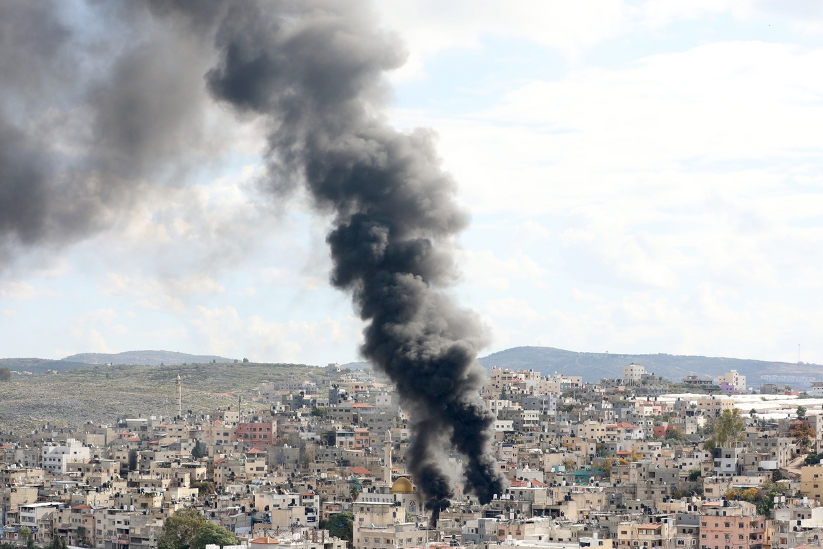 epa11056648 Smoke rises among buildings following targeted explosions during an Israeli military operation at Nur Shams refugee camp near the West Bank city of Tulkarem, 04 January 2024. According to the Palestinian Health Ministry, at least 17 Palestinians were injured and more than one hundred were arrested in Israeli army operations at Nur Shams refugee camp, which started on 02 January. EPA/ALAA BADARNEH