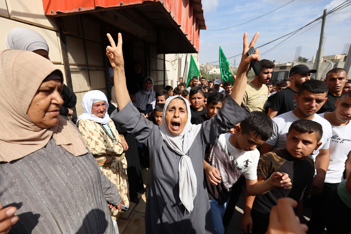 epa10913165 Palestinian women react at the funeral of two men at Qabatya village near the West Bank city of Jenin, 11 October 2023. According to the Palestinian Health Ministry, the two men were killed during clashes with Israeli troops near the Jalama checkpoint earlier in the day. EPA/ALAA BADARNEH