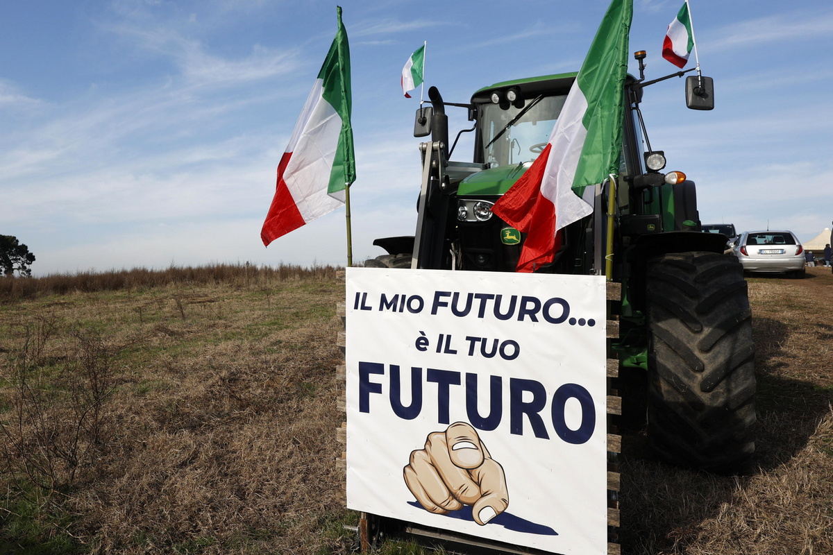 epa11133546 A placard that reads in Italian 'my future and your future' as tractors line up during a farmers protests in Nomentana street, Rome, Italy, 07 February 2024. Farmers in Italy continue to protest against what they say are harmful European agricultural policies, echoing demonstrations in other parts of Europe, including Germany, Belgium and France. EPA/FABIO FRUSTACI