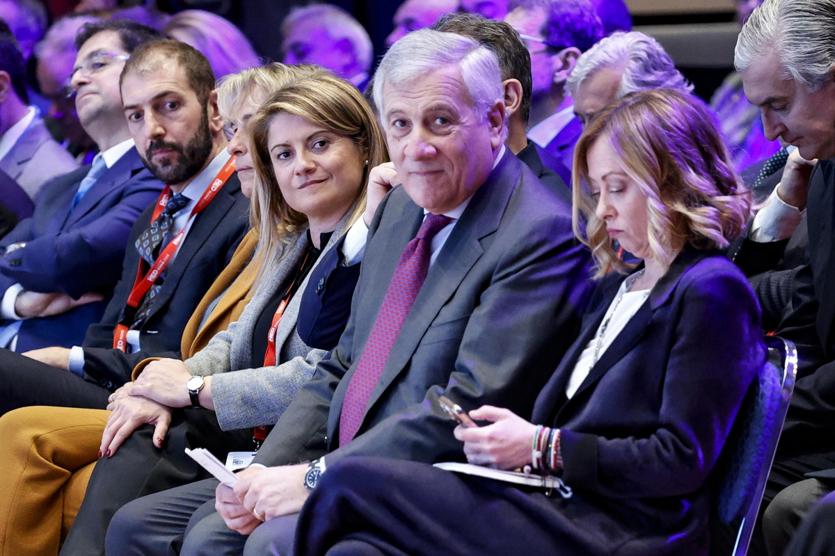 epa11743516 Italian Prime Minister Giorgia Meloni (R), Italian Minister for Foreign Affairs Antonio Tajani (C) and Italian Undersecretary of State for Foreign Affairs, Maria Tripodi (L) attend the Rome Med - Mediterranean Dialogues conference in Rome, Italy, 27 November 2024. The MED conference is held in Rome from 25 until 27 November for high-level discussions on the most critical issues affecting the wider Mediterranean. EPA/FABIO FRUSTACI
