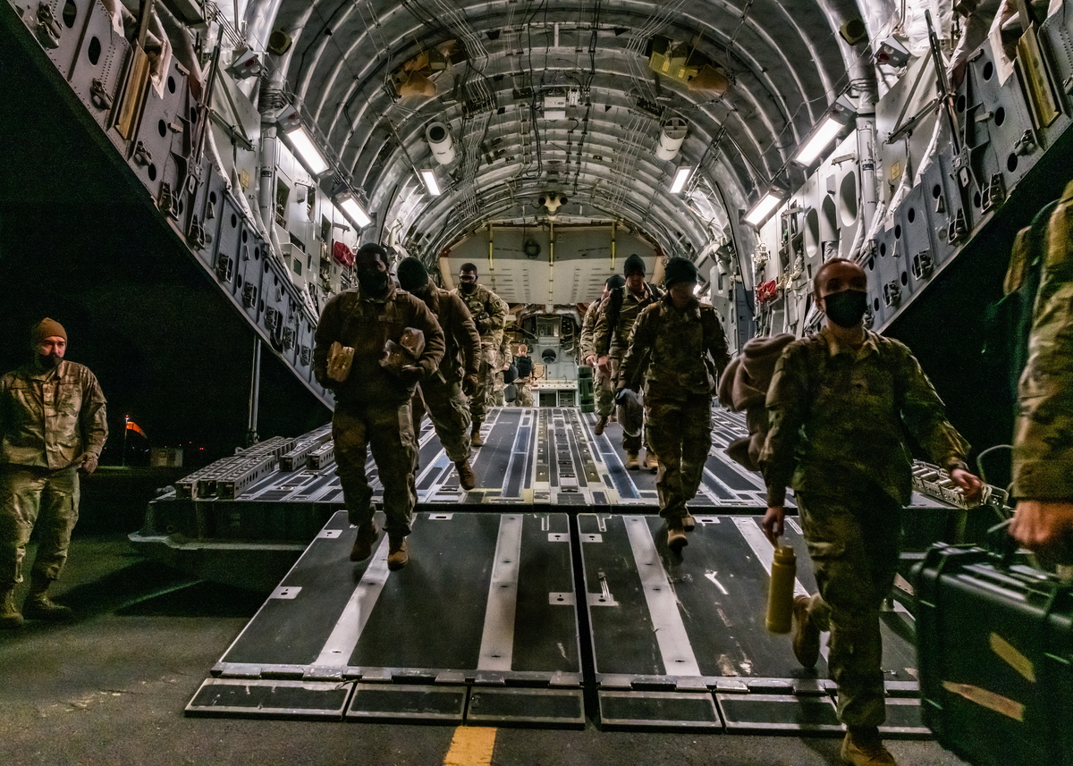 epa09729697 A handout photo made available by the US Army shows the arrival of 18th Airborne Corps Soldiers in Wiesbaden, Germany, 04 February 2022 (issued 05 February 2022). These are the first of 2,000 Soldiers to arrive in Europe following the Pentagon's announcement of additional forces moving from the United States to Europe in support of NATO allies. The 18th Airborne Corps, which serves as America's Contingency Corps, will provide a Joint Task Force-capable headquarters in Germany, as 1,700 Paratroopers from the 82nd Airborne Division deploy to Poland. EPA/SGT. STEPHEN PEREZ/US ARMY HANDOUT HANDOUT EDITORIAL USE ONLY/NO SALES