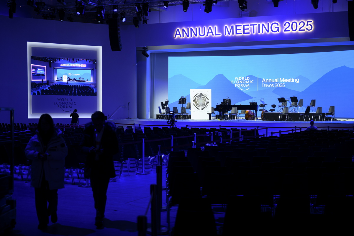 Εργαζόμενοι περπατούν στην αίθουσα συνεδριάσεων του συνεδριακού κέντρου πριν από την 55η ετήσια συνάντηση του Παγκόσμιου Οικονομικού Φόρουμ (WEF) στο Νταβός της Ελβετίας, 19 Ιανουαρίου 2025. EPA/LAURENT GILLIERON