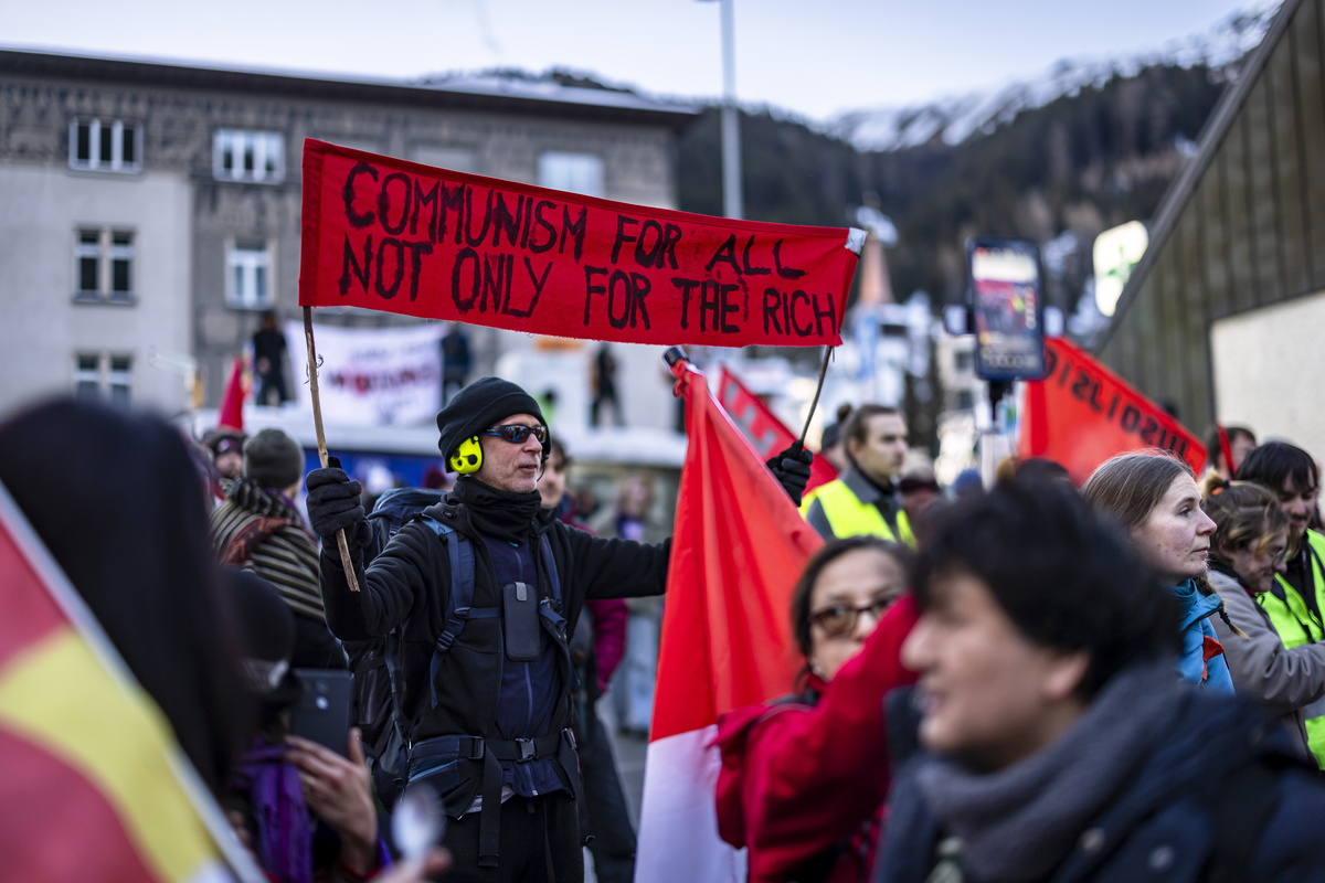 Ένας άνδρας κρατά ένα πανό που γράφει «Κομμουνισμός για όλους, όχι μόνο για τους πλούσιους» σε διαδήλωση πριν από την ετήσια συνεδρίαση του Παγκόσμιου Οικονομικού Φόρουμ (WEF) στο Νταβός της Ελβετίας, 19 Ιανουαρίου 2025. EPA/MICHAEL BUHOLZER