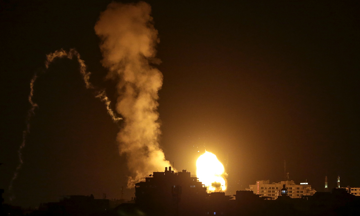 epa10605386 Smoke rises after Israeli air strike in the northern Gaza strip, in Gaza City, early 03 May 2023. The airstrikes come after militant groups in Gaza claimed responsibility for firing dozens of rockets from the Gaza Strip toward southern Israeli cities after Palestinian prisoner Khader Adnan's death was announced on 02 May. EPA/MOHAMMED SABER