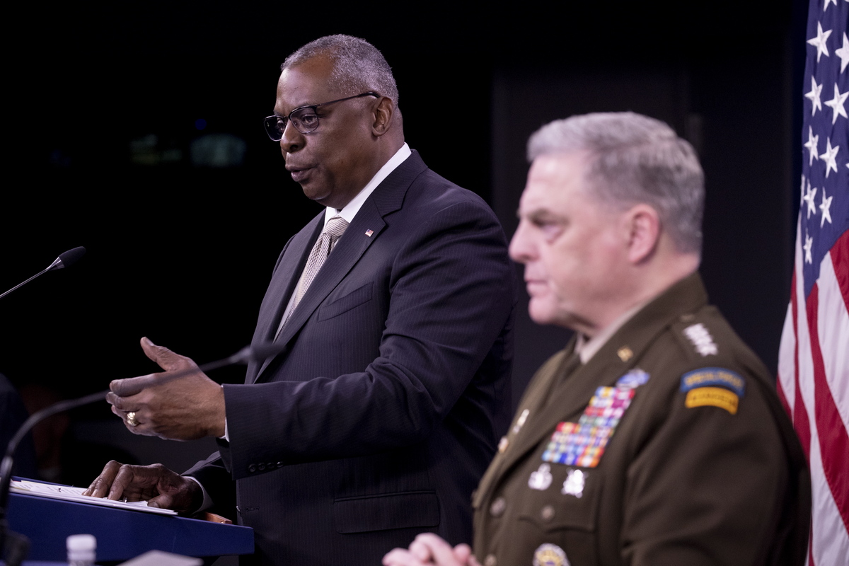 epa09970002 US Secretary of Defense Lloyd Austin (L) and US Chairman of the Joint Chiefs of Staff Mark Milley (R) attend a news conference after participating in a virtual meeting of the Ukraine Defense Contact Group, at the Pentagon in Arlington, Virginia, USA, 23 May 2022. Allies and partners consisting of 47 countries participated in the virtual meeting on aiding Ukraine during the ongoing Russian invasion. EPA/MICHAEL REYNOLDS
