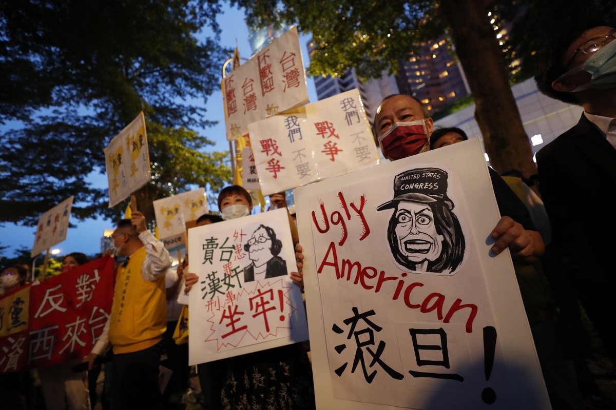 epa10102617 Taiwanese hold placards during a protest against the visit of US House Speaker Nancy Pelosi, in Taipei, Taiwan, 02 August 2022. China has raised a warning stating its military will not sit idle if US House of Representatives Speaker Pelosi visits Taiwan. Pelosi is leading a Congressional delegation to the Indo-Pacific region with a visit to Singapore, Malaysia, South Korea and Japan. EPA/RITCHIE B. TONGO