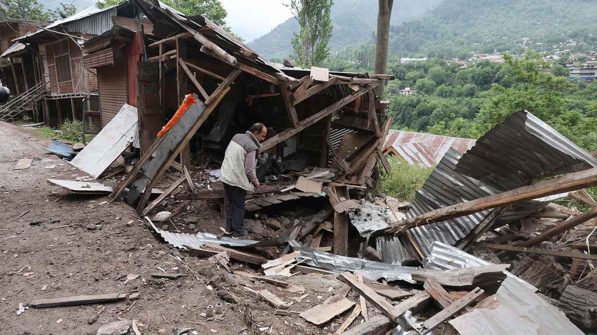 epaselect epa12085373 An Indian Kashmiri man inspects a house damaged by cross-border shelling from Pakistan, near the line of control at Lagamma Uri, Kashmir, India, 09 May 2025. According to Wing Commander Vyomika Singh, on the night of 07 and 08 May 2025, Pakistan attempted to engage a number of military targets in northern and western India using drones and missiles and Indian armed forces targeted air defence radars and systems at a number of locations in Pakistan. EPA/FAROOQ KHAN