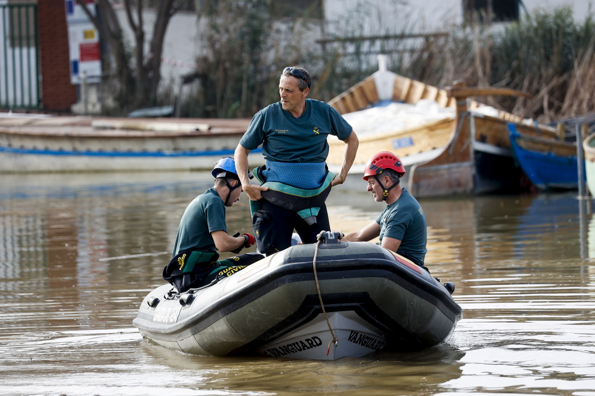 epa11702291 Members of the GEAS, Brigade of the Civil Guard specialized in sub aquatic activities, search for victims within the coastal lagoon of the Albufera in Valencia, Spain, 05 November 2024. The devastating floods in Valencia and neighboring provinces have caused at least 213 fatalities, as efforts to search for missing people, provide supplies and care for the victims continue a week after the DANA (high-altitude isolated depression) weather phenomenon hit the east of the country on 29 October. EPA/BIEL ALINO