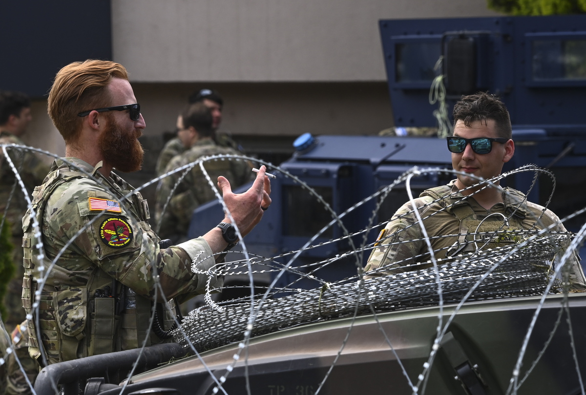 epa10669256 Soldiers of the US contingent of the NATO-led international peacekeeping Kosovo Force (KFOR) take positions in front of the municipality building in Leposavic, Kosovo, 02 June 2023. At least thirty KFOR peacekeepers and fifty two civilians were injured in clashes between security forces and ethnic Serbs in Zvecan on 29 May 2023. Tensions continue in northern Kosovo’s region, with a majority of ethnic Serbian people, which arose after ethnic Albanians mayors took offices in four towns following elections boycotted by the Serbian community. EPA/GEORGI LICOVSKI