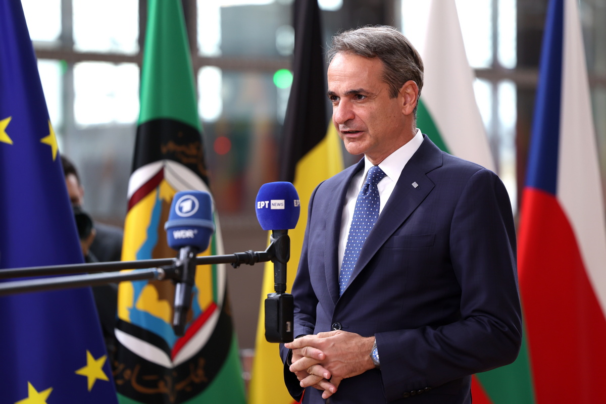 epa11662161 Greece's Prime Minister Kyriakos Mitsotakis talks to the media as he arrives to attend the EU-Gulf Cooperation Council (GCC) summit in Brussels, Belgium, 16 October 2024. This is the first summit between the EU leaders and the GCC, aiming to develop a closer partnership. The European Union is the second-largest trade partner for the GCC countries, generating €170 billion in trade in 2023, imports of mineral fuels accounted for over 75% of EU imports from GCC countries. Since 2020, fuel imports have more than tripled mainly due to the armed conflict between Russia and Ukraine. EPA/CHRISTOPHER NEUNDORF