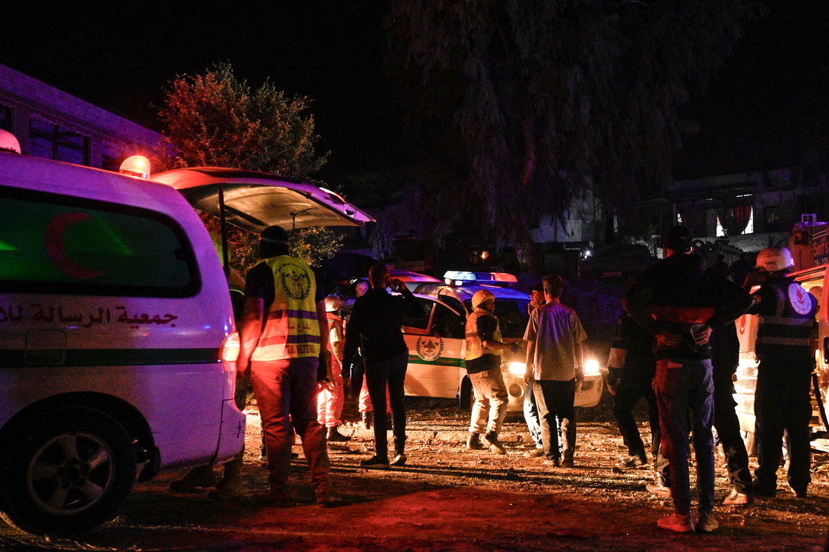 epa11673807 Members of an emergency crew gather at a site near the Rafik Hariri University Hospital (RHUH), following Israeli airstrikes in the Jnah District of Beirut, Lebanon, 21 October 2024. According to the Lebanese Ministry of Health, more than 2,400 people have been killed and over 11,600 others have been injured in Lebanon since the start of recent escalations of hostilities. EPA/STR