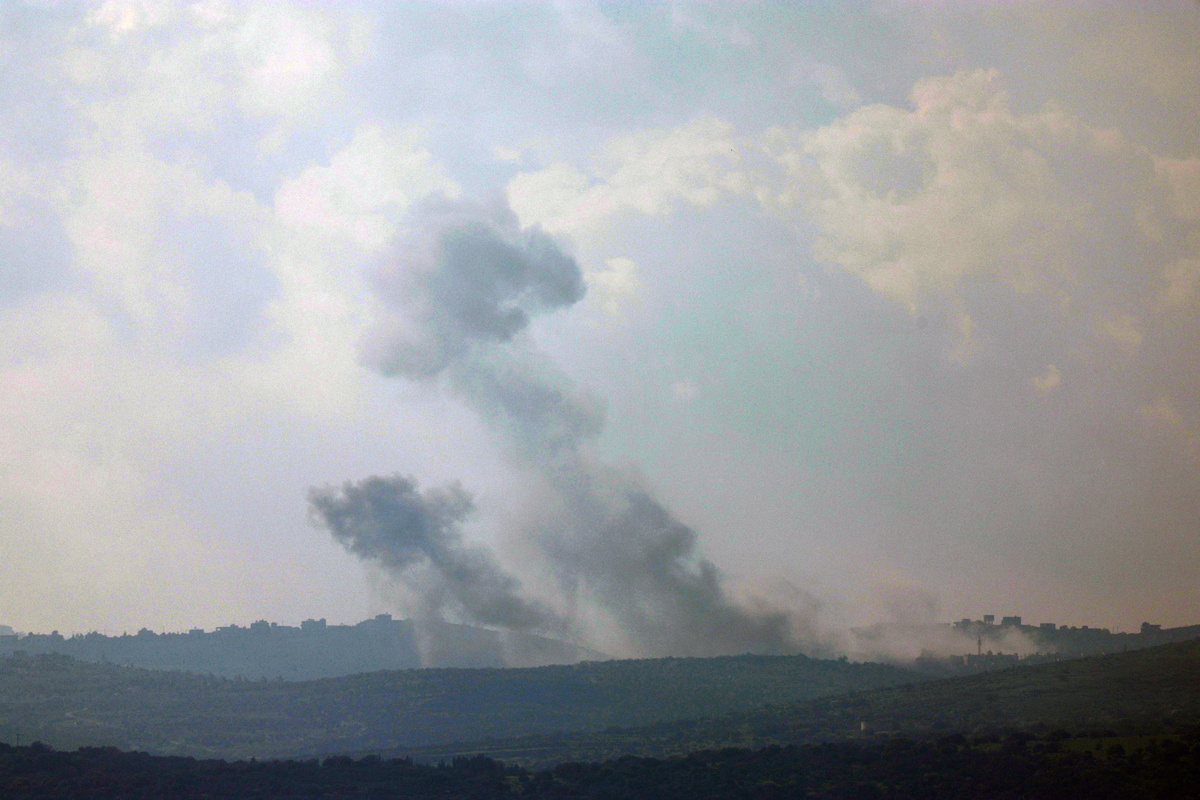 epa11180764 Smoke rises from the southern Lebanon's village of Blida as a result of an Israeli airstrike, as seen from an undisclosed location in northern Israel, 25 February 2024, An Israeli army spokesperson reported on 25 February that the IDF Aerial Defense Array intercepted a suspicious aerial target that crossed from Lebanon into the Upper Galilee in northern Israel. The IDF said to have struck the sources of the fire. EPA/ATEF SAFADI