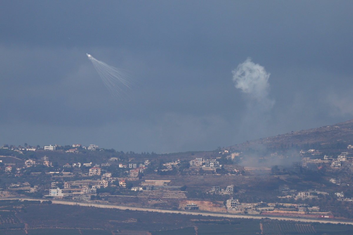 epa11634774 Israeli artillery shells the village of Odaisseh in southern Lebanon along the border with Israel, as seen from the Upper Galilee, northern Israel, 01 October 2024. On 30 September Israel announced the beginning of a 'limited, localized and targeted' ground operation against Hezbollah in southern Lebanon. EPA/ATEF SAFADI