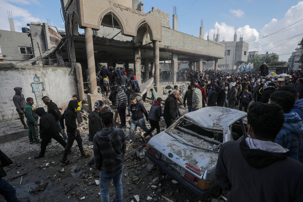 epa11126263 Palestinians search for missing people under the rubble of a destroyed mosque in Deir Al Balah town, Gaza Strip, 04 February 2024, following an Israeli air strike. More than 27,000 Palestinians and over 1,300 Israelis have been killed, according to the Palestinian Health Ministry and the Israel Defense Forces (IDF), since Hamas militants launched an attack against Israel from the Gaza Strip on 07 October 2023, and the Israeli operations in Gaza and the West Bank which followed it. EPA/MOHAMMED SABER