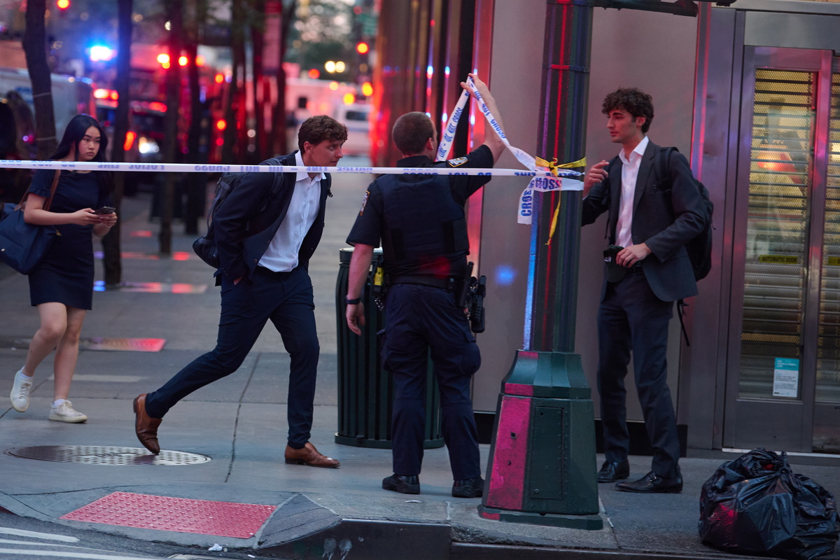 epaselect epa12269483 Pedestrians walk through a barricade as New York City Police Officers respond to an active shooter incident in midtown, occurring inside at 345 Park Ave, in New York, New York, USA, 28 July 2025. Police officials confirmed the shooter was 'neutralized' Monday night. EPA/LLOYD MITCHELL
