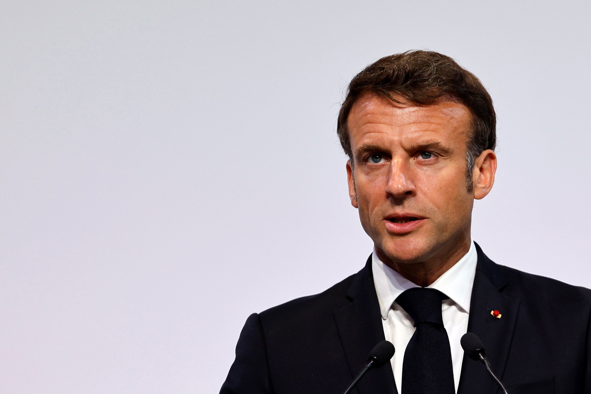 epa10705199 French President Emmanuel Macron delivers a speech during the opening session of the New Global Financial Pact Summit at the Palais Brogniart in Paris, France, 22 June 2023. World leaders, heads of international organizations and activists are gathering in Paris for a two-day summit aimed at seeking better responses to tackle poverty and climate change issues by reshaping the global financial system. EPA/LUDOVIC MARIN / POOL MAXPPP OUT