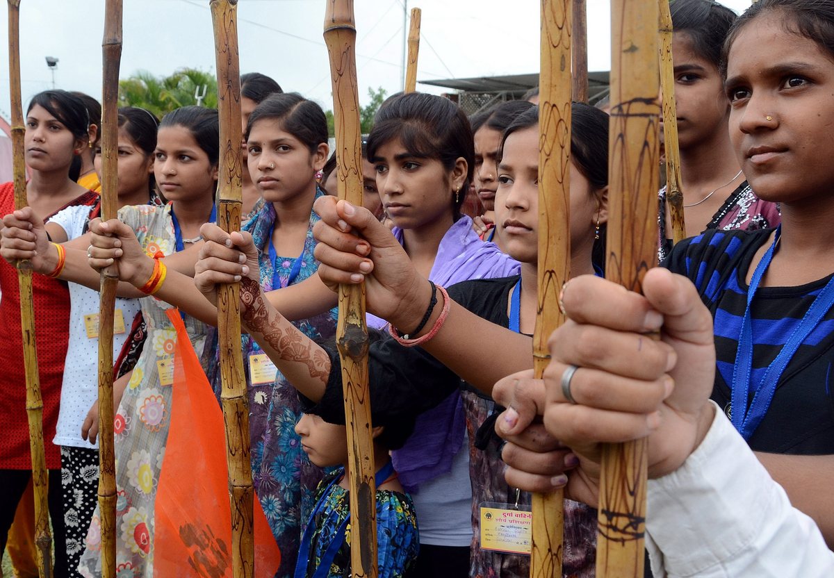epa03739889 Young Indian Hindu girls of Durga Vahini, athe 'saffron brigade women's' wing of Hindu hardline organization Vishwa Hindu Parishad, take part in a self defense training camp in Bhopal, India on 11 June,2013. In the wake of the increase in crime against women in the country these young girls are being given training to operate sticks and guns and to develop the skills of self defense. EPA/SANJEEV GUPTA